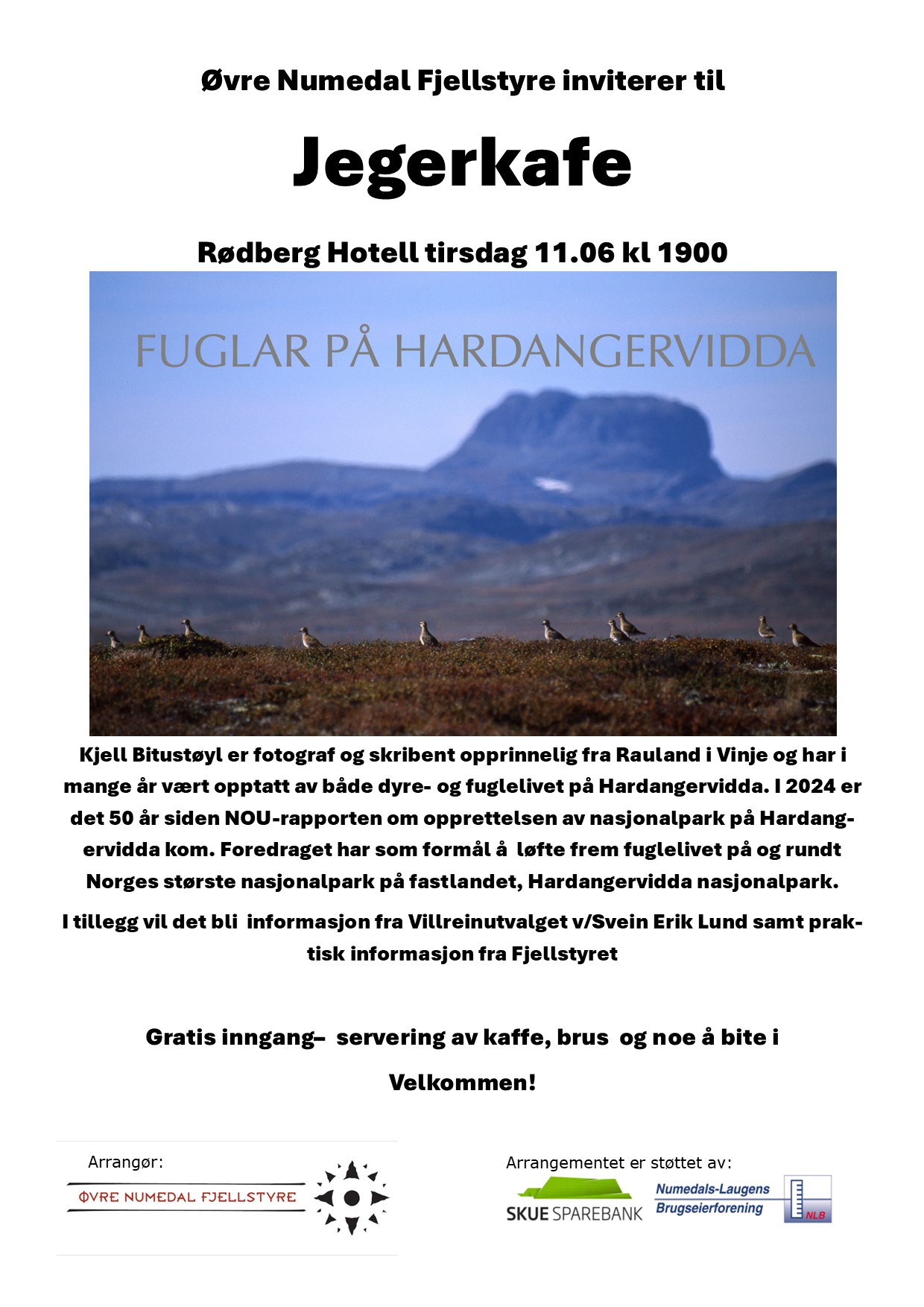 Vi har vært heldige å få fotograf og skribent Kjell Bitustøyl på besøk. Han vil holde et foredrag om fuglelivet på Hardangervidda. I tillegg vil det bli informasjon fra Villreinutvalget v/Svein Erik Lund samt praktisk informasjon fra Fjellstyret.