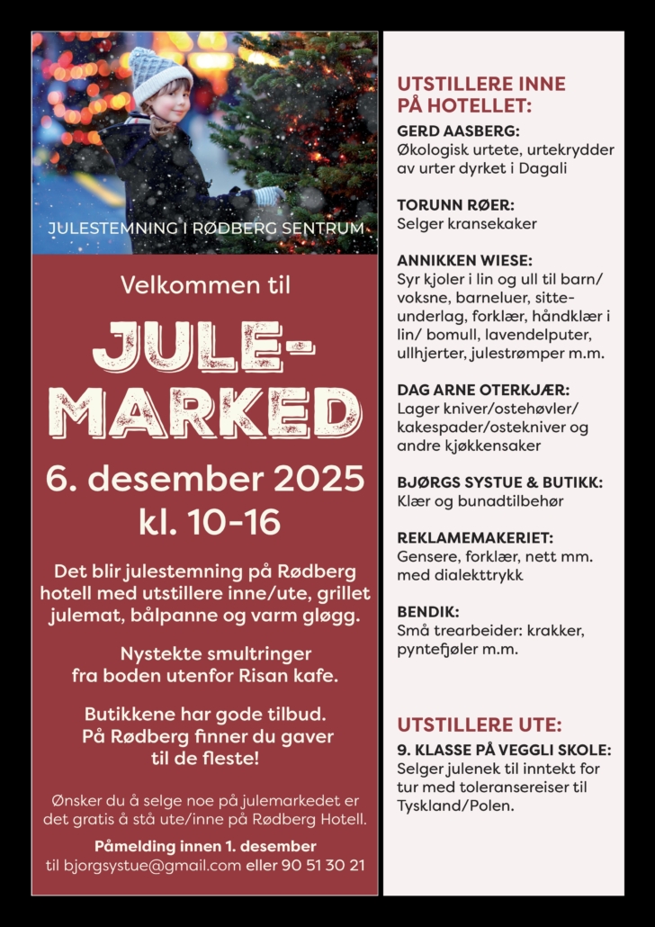 Alle våre fine butikker holder åpent med gode tilbud til kl. 16.00 og selve markedet vil være inne og utenfor Rødberg hotell. Her vil det bli gøy for de minste, pepperkaker, julekos og mye annet gøy!