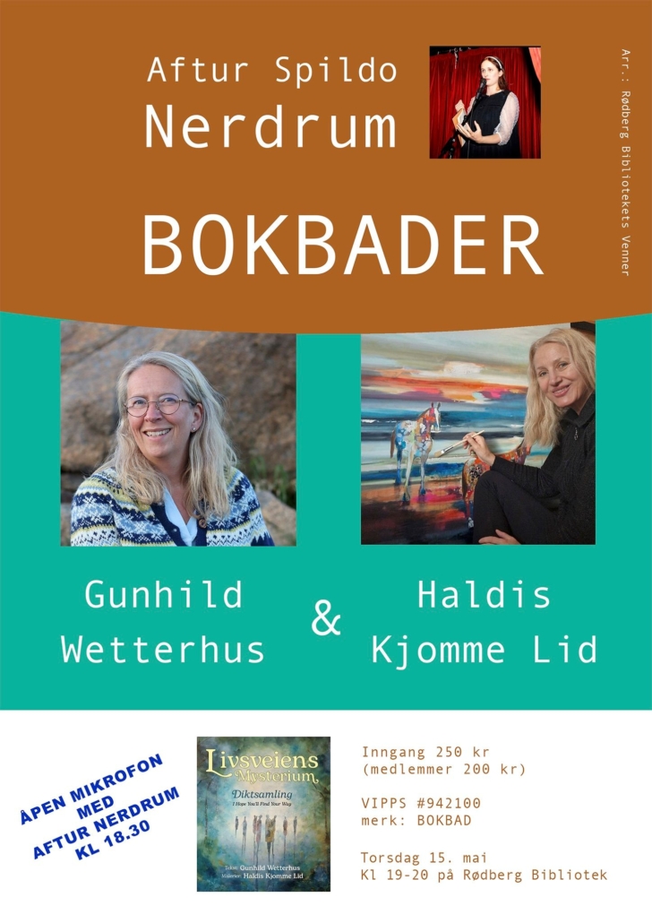 Bokbad fra kl 19-20 med forfatterinne Gunhild Wetterhus & malerinne Haldis Kjomme Lid som sammen har utgitt diktboka «Livsveiens mysterium». Aftur Nerdrum leder samtalen om boka og menneskene bak.