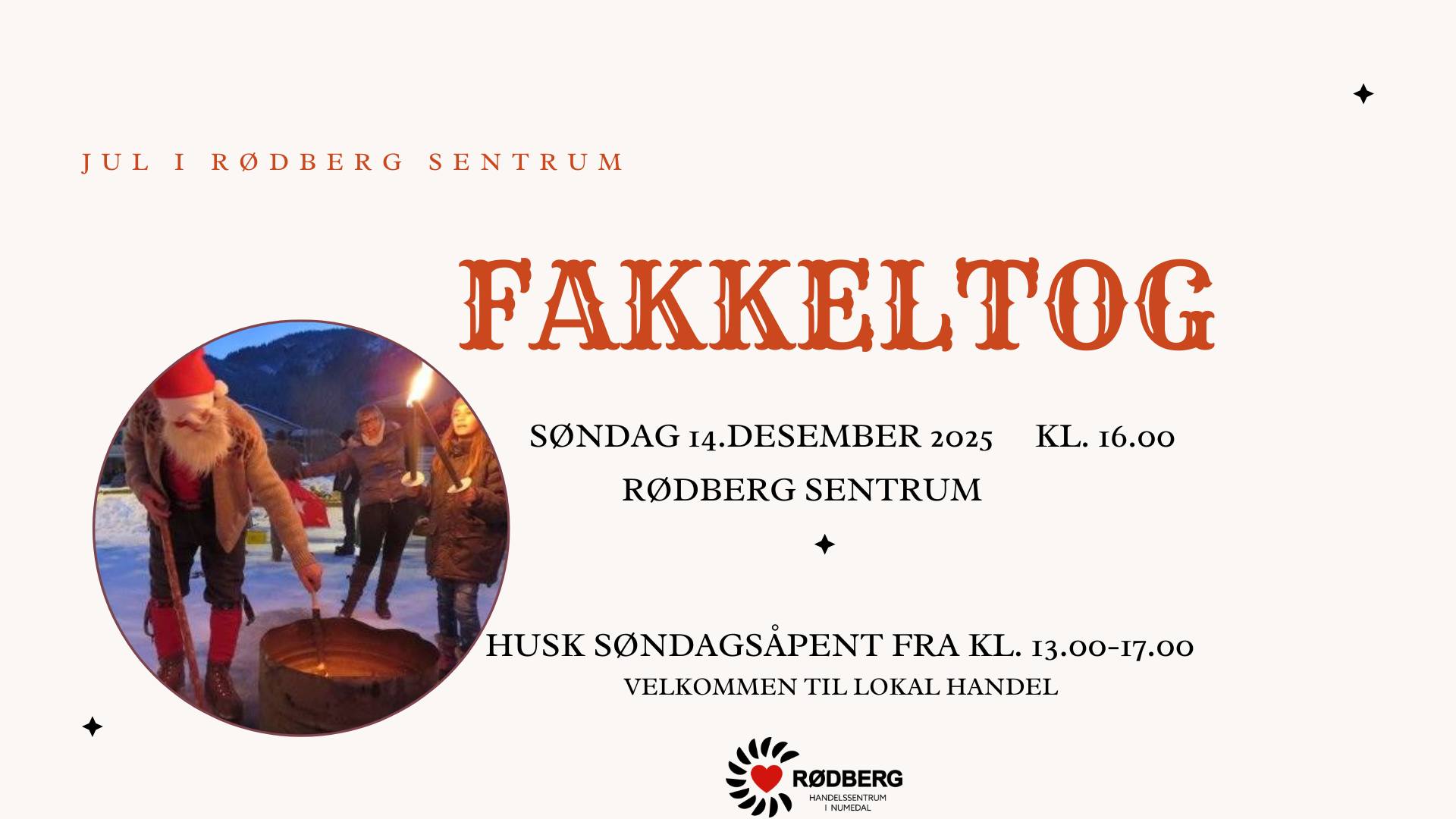 Tradisjonstro har vi fakkeltog i Rødberg sentrum. Kom i skikkelig julestemning sammen med oss. Program 14 desember: Fakkeltoget starter kl.16.00 utenfor Rødberg Hotell Kanskje nissen kommer? Ferske smultringer fra Nye Risans eftf. Alle butikkene har åpent fra 13.00-17.00 Velkommen til vårt julepyntet sentrum. Takk for at du velger å handle lokalt - det er viktig for oss